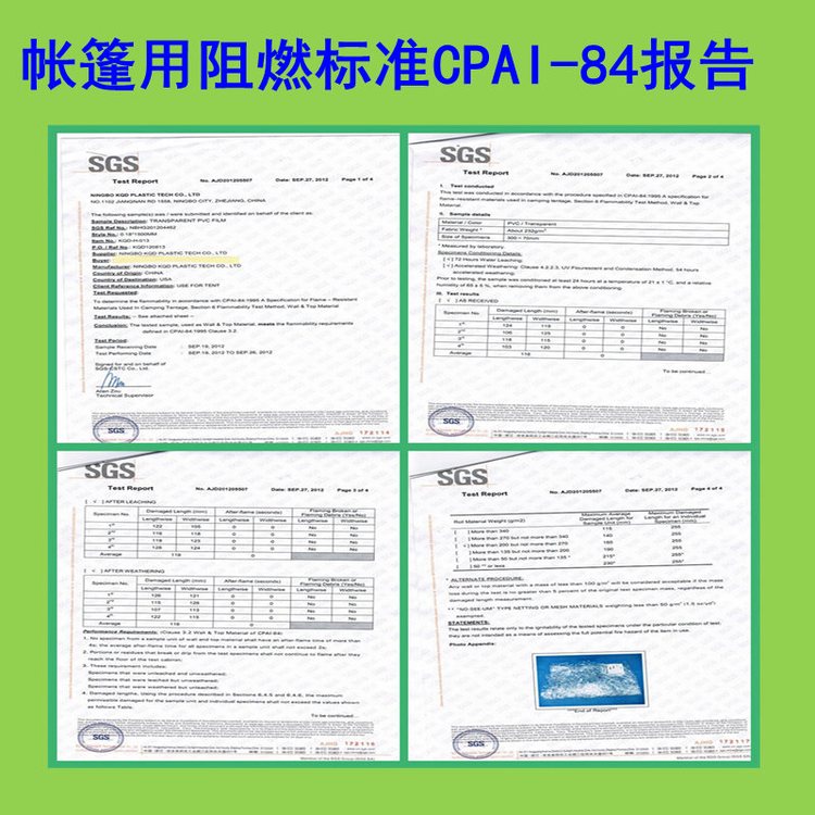 3.抗渗水性:GB/T4744-1997进行检验:静水压4.9kPa时,布料不渗水