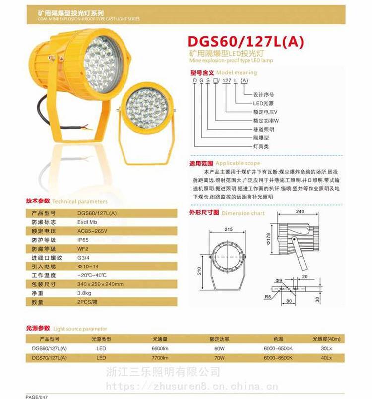 浙江三乐照明矿用隔爆型LED大功率投光灯DGS60/127L(A) 品牌 | 三乐照明 | ||