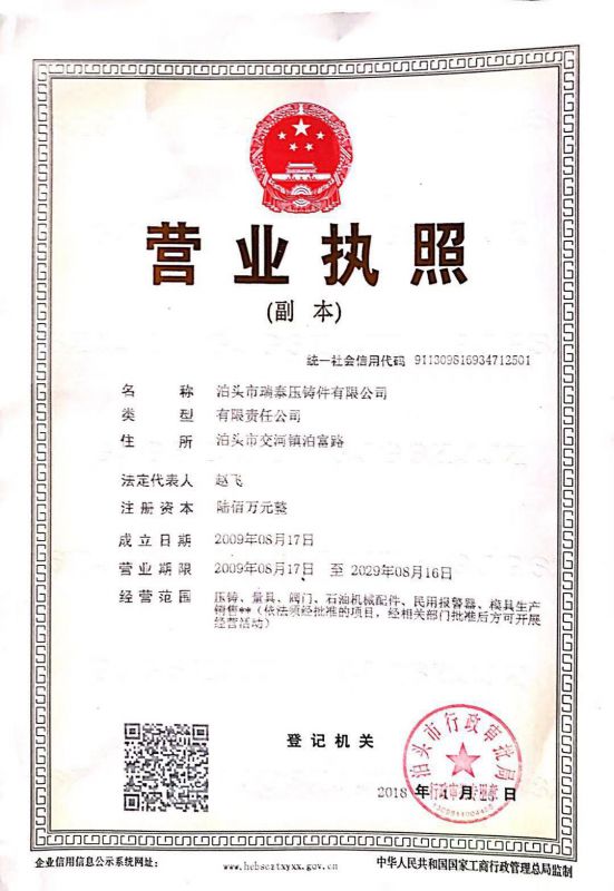 泊头市瑞泰压铸件有限公司多年的探索与追求,积累了丰富的生产经验,已成为国内知名的压铸模具及压铸件生产厂家。