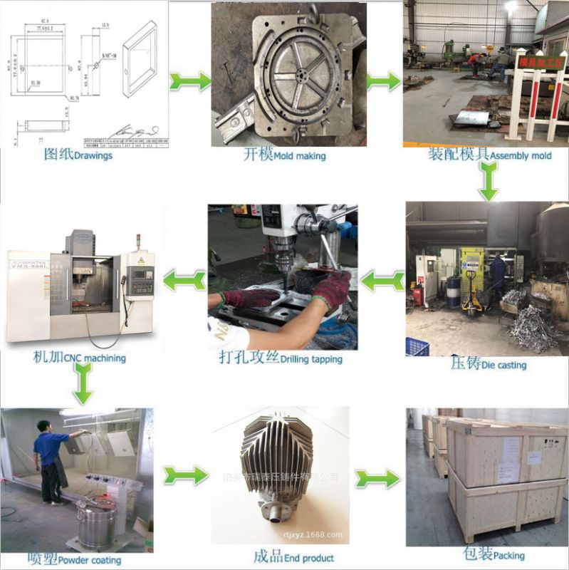 3.工艺流程:开模-熔料-压铸成型-去毛刺打模-机加工处理-表面处理(包括抛光、振动研磨、喷砂、喷粉、喷漆、电镀等)-包装