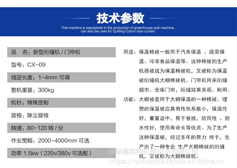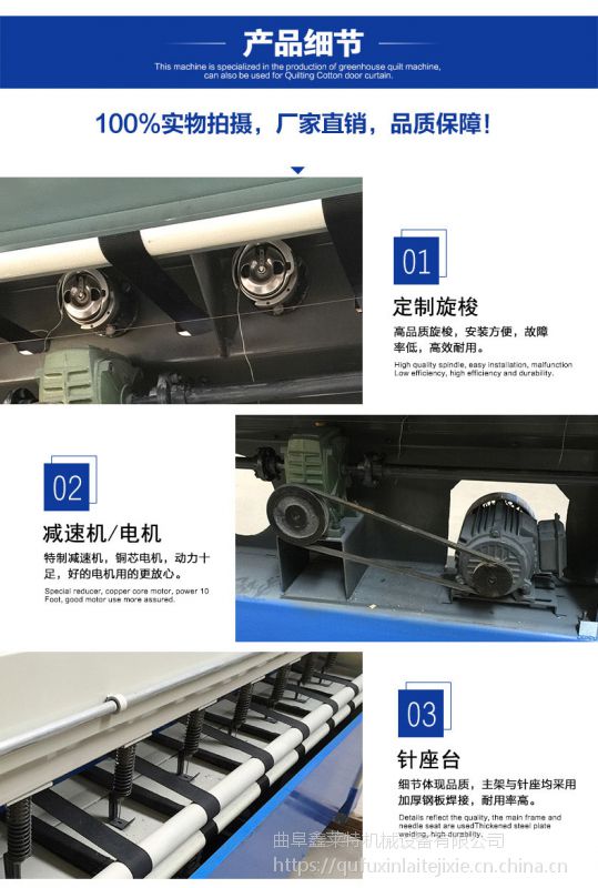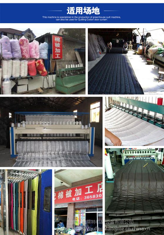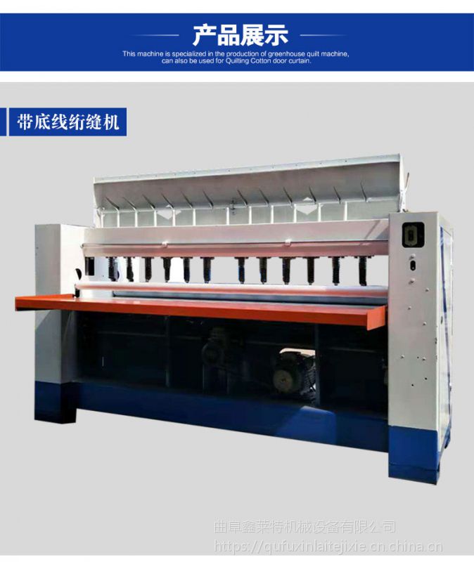 本机是我厂***新研发的新款新一代全自动大棚棉被机引被机-----精巧型绗缝机.它突破了传统绗缝技术的占地约束,结合了伸缩型绗缝理念,使该机拥有了流动便捷,占地***小,外形美观,质量稳定的***新技术.