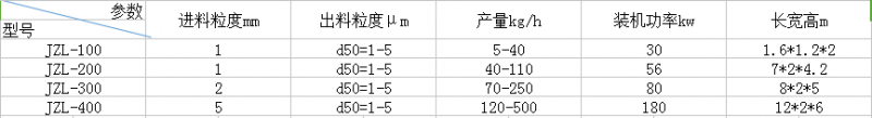 1、两种型号的设备的进料粒度都为-200目,出料粒度都为d50=0.5-5μm,200型的生产能力大概每小时30到80公斤,400型约为200-350kg/h。