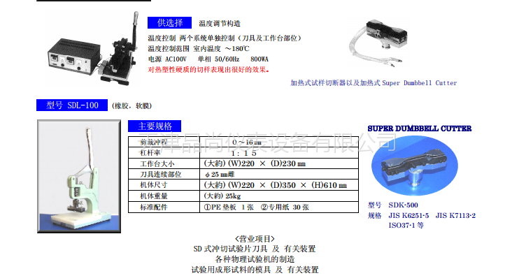 型号 sdl-200 (橡胶 ,软塑料 ,未硫化橡胶 等) 操作方法 1)把刀头部完全插在圆筒状的刀具安装孔部位。 用螺丝钉拧住。 2)把专用纸放在工作台上,把切样放在纸上面。 3)用适度的力量按下操作杠杆就可切断试样片。 主要规格 剪裁冲程 0~16 ㎜ 杠杆率 1:30 工作台大小 (大約) (w)220 × (d)290 ㎜ 刀具连续部位 φ25 ㎜雌 机体尺寸 (大約) (w)280 × (d)400 × (h)640 ㎜ 机体重量 (大約) 60kg 标准配件 pe 垫板 1张 专用纸 30 张 附着定塞器 供选择 温度调节构造 温度控制 两个系统单独控制(刀具及工作台部位) 温度控制范围 室内温度 ~180℃ 电源 ac100v 单相 50/60hz 800wa 对热塑性硬质的切样表现出很好的效果。 型号 sdl-100 (橡胶,软膜) 主要规格 剪裁冲程 0~16 ㎜ 杠杆率 1:15 工作台大小 (大約) (w)220 × (d)230 ㎜ 刀具连续部位 φ25 ㎜雌 机体尺寸 (大約) (w)220 × (d)350 × (h)610 ㎜ 机体重量 (大約) 25kg 标准配件 pe 垫板 1张 专用纸 30 张 <营业项目> sd 式冲切试验片刀具 及 有关装置 各种物理试验机的制造 试验用成形试料的模具