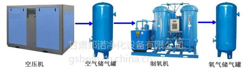 压缩空气经空气净化系统除去油、水、固体尘埃等杂质后进入装有沸石分子筛的吸附塔,空气中的氮气、二氧化碳、水蒸气等被分子筛大量吸附,而氧气则因为扩散速率大而穿过吸附剂而实现分离。