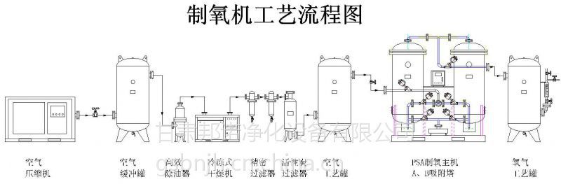 压缩空气经空气净化系统除去油、水、固体尘埃等杂质后进入装有沸石分子筛的吸附塔,空气中的氮气、二氧化碳、水蒸气等被分子筛大量吸附,而氧气则因为扩散速率大而穿过吸附剂而实现分离。