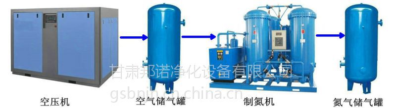 整套系统由以下部件组成:压缩空气净化组件、空气储罐、氧氮分离装置、氮气缓冲罐。
