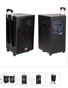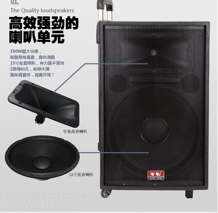 15寸低音喇叭1只,号角高音喇叭1只,2路3寸低音导相孔,350w实际大功率,内置12v/20ah大容量充电电池音量工作3小时(一般音量4-5小时)