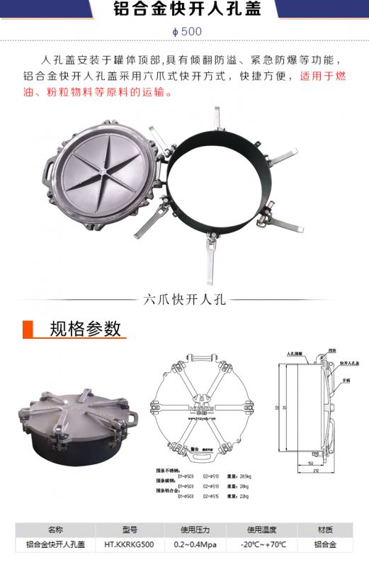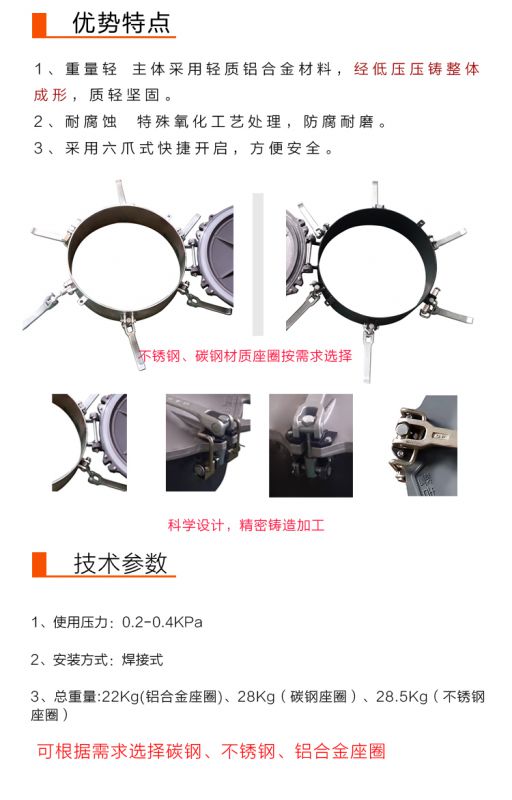 这款六爪全铝合金快开人孔盖,主体由铝合金经低压铸造整体成形,质轻坚固。六爪均采用金属铜材质,经久耐用。工艺上设计为6爪控制,充分考虑了其受力分布,在保证密封性能的同时也zuida限度的保证了便捷性能。