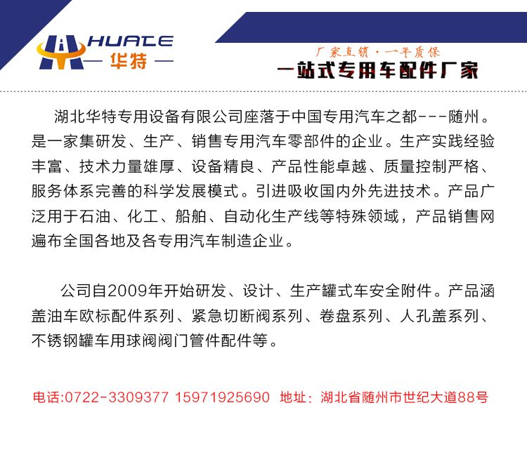 公司自2009年开始研发、设计、生产罐式车安全附件。产品涵盖油车欧标配件系列、紧急切断阀系列、卷盘系列、人孔盖系列、不锈钢罐车用球阀阀门管件配件等。