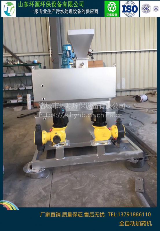 本装置是粉状药剂的全自动连续配置及投加系统。干粉药剂从料斗下部的螺旋推进器进入预混器与清水进行预混,被湿润的物料进入配制槽进行稀释混合,按用户要求浓度进行配制;