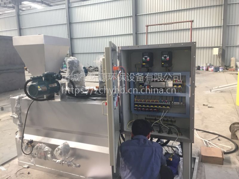 配制溶液从配制槽经熟化槽再进入储存槽,当储存槽液位处于高位时,配制过程自动停止,当溶液下降到低液位时,自动启动配料过程。配制槽和熟化槽均设置搅拌器,充分保证药剂的稀释和熟化。配制流量及浓度可通过调节进水流量和调节螺旋轴转速来确定。