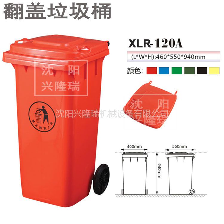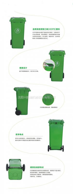 沈阳环卫垃圾桶厂家,请找沈阳兴隆瑞机械设备有限公司。我们供应的耐寒、韧性强、新料低压高密度聚乙烯hdpe材质塑料垃圾桶,被广泛应用于环卫、物业小区。冬天不硬、不脆,同时加入抗紫外线剂延长变色、老化等时间。库存量大,几百个一般可当日发货。