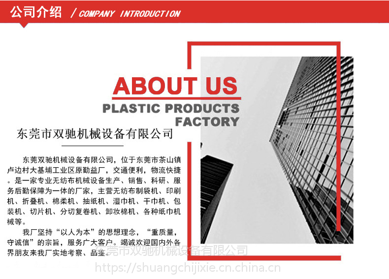 东莞双驰机械设备有限公司,位于东莞市茶山镇卢边村大基埔工业区原勤益厂,交通便利,物流快捷。是一家专业无纺布机械设备生产、销售、科研、服务后勤保障为一体的厂家,我厂主要技术销售骨干已在无纺布行业从事设备研究开发多年,积累了丰富的经验,熟知这一行业的工艺及生产过程。我厂拥有雄厚的技术力量及丰富的制造经验,可根据客户的要求或市场上的无纺布产品来设计制造高效、实用的无纺布深加工后续设备,愿为您量身定做,如:无纺布制袋机、印刷机、折叠机、棉柔机、抽纸机、湿巾机、干巾机、包装机、切片机、分切复卷机、卸妆棉机、各种纸巾机械等。