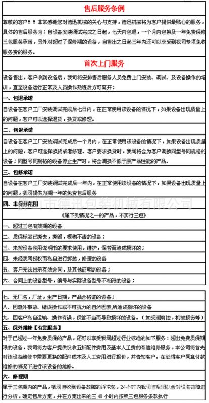 德迅包装机械有限公司以生产包装机械设备为主,德迅生产的包装机械设备价格差异主要以区分机器型号来划分价格(型号的选择主要通过客户产品的尺寸大小)其次按照客户的特殊制定要求,如客户需要的包装机只需接触物料用不锈钢或包装机全体用不锈钢则制造的成本价格会不一样,再是根据包装机械设备的各个配件(客户要求的配机品牌要求,请客户根据自己的需求选择方案)。***后是标准机和非标准机的价格不同,一般来说标准机的价格都是固定的价格,非标准机需要按照客户的产品设计机型,再修改机器配件等,客户也可以根据自己市场的要求制定产品包装样式及要求,机器完成后,根据成本的多少计算价格。