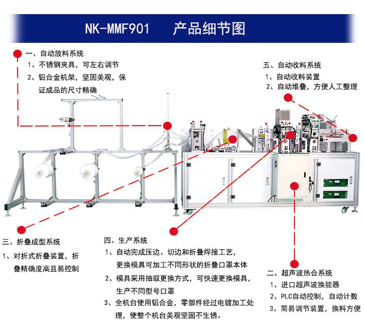 1、本机台自动完成压边、切边和折叠焊接工艺,更换模具可加工不同形状的折叠口罩本体。