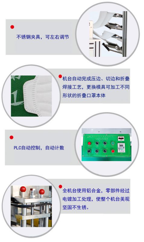 1、本机台自动完成压边、切边和折叠焊接工艺,更换模具可加工不同形状的折叠口罩本体。