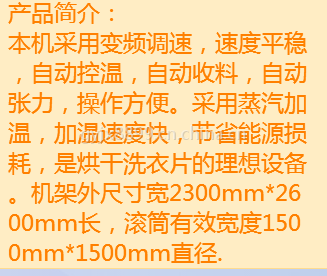 本机采用变频调速,速度平稳,自动控温,自动收料,自动张力,操作方便。采用蒸汽加温,加温速度快,节省能源损耗,是烘干洗衣片的理想设备。机架外尺寸宽2300mm*2600mm长,滚筒有效宽度1500mm*1500mm直径.