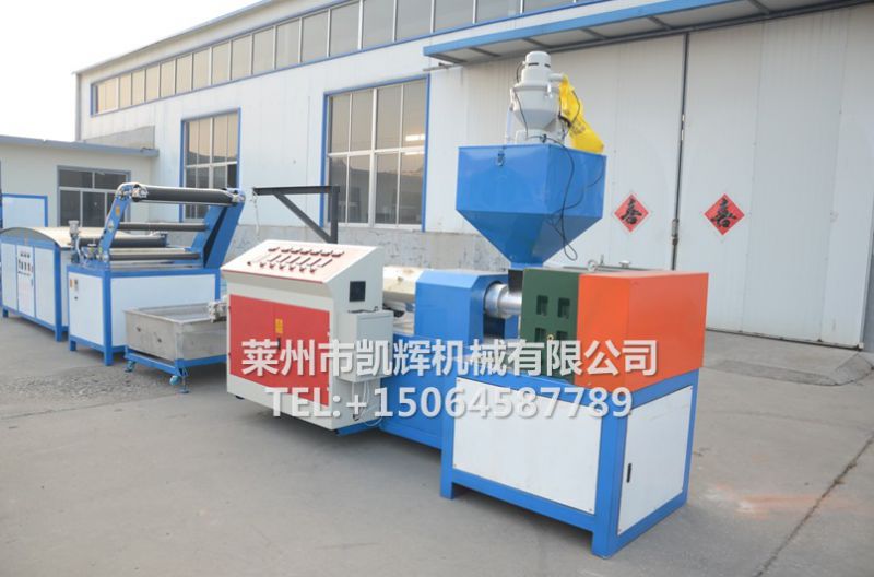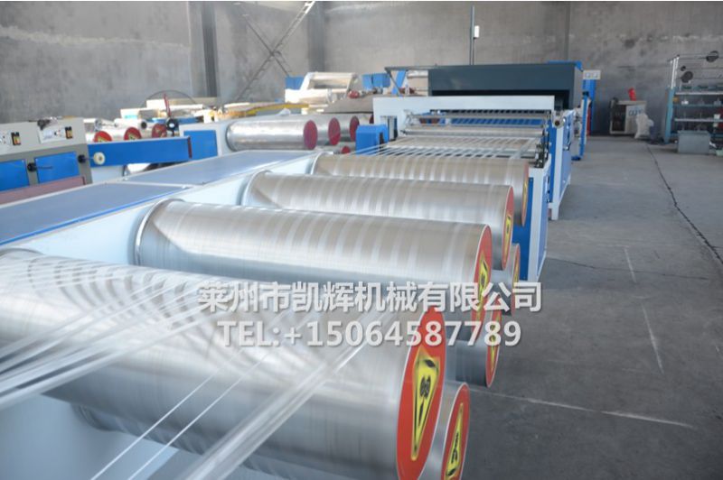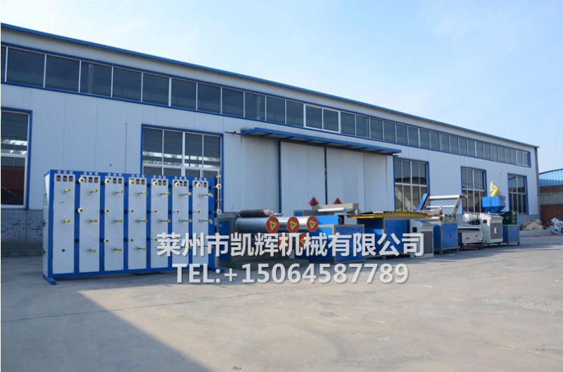 100%聚丙烯或是再生颗粒,片料经过螺杆热熔,出模具冷却定型,切割成带状,经过哄板加热,延伸出有拉力的撕裂膜绳子,收卷成成品