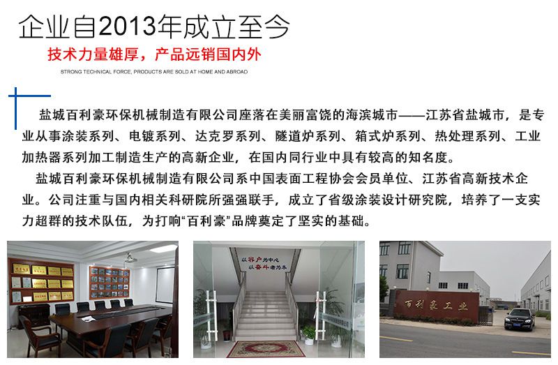 盐城百利豪环保机械制造有限公司系中国表面工程协会会员单位、江苏省高新技术企业。公司注重与国内相关科研院所强强联手,成立了省级涂装设计研究院,培养了一支实力超群的技术队伍,为打响“百利豪”品牌奠定了坚实的基础。