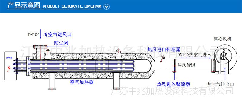 1、管道加热器能使空气加热到很高的的温度,可达850℃,壳体温度只有50℃左右。