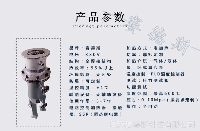 循环式液体电加热器是通过泵强迫对流的的方式对流体进行加热的,是通过泵强制循环的一种加热方式。循环式电加热器具有体积小,加热功率大,热效率高的特点,其工作温度及压力都高,***高工作温度可达600℃,耐压可达20mpa。循环式电加热器结构密封可靠,无“跑、冒、滴、漏”等现象,介质加热均匀,升温迅速稳定,可实现温度、压力、流量等参数的自动控制。