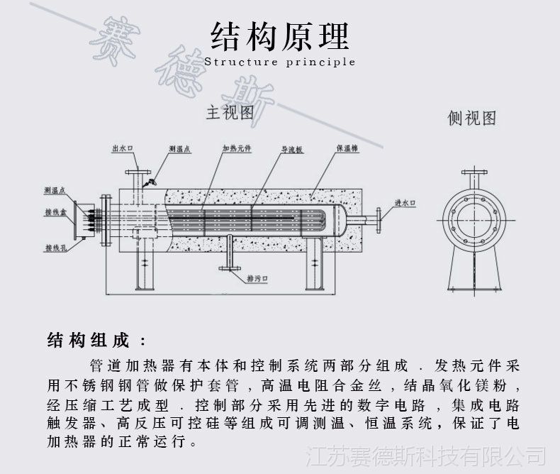 电加热器主要运用于液体的加热物体,如酸碱液、化学试剂、水、油等,主要以不锈钢材质为表面金属护套材料,如:304、316不锈钢等为主,具有机械强度高、耐热、抗腐、不易结垢等优点。