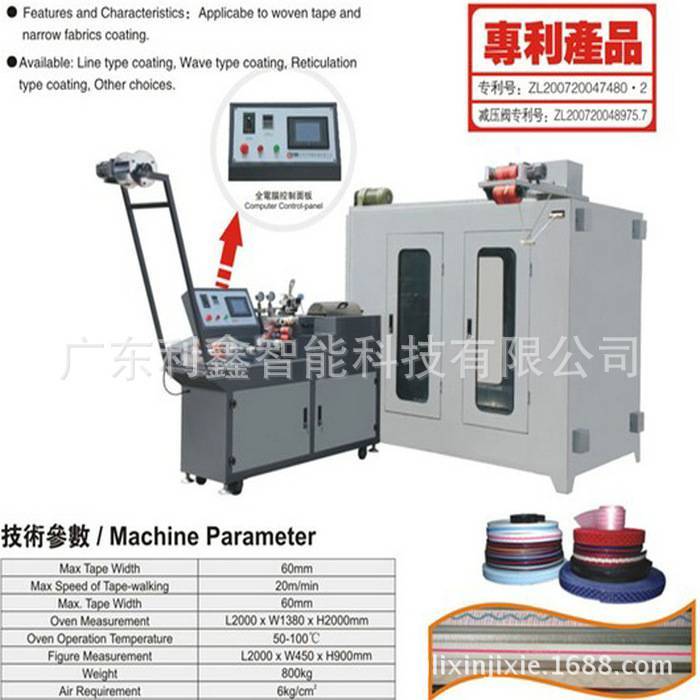 全自动织带涂层机主要针对内衣肩带、无弹织带、弹性织带、包边带等以及各种纺织品表面硅胶涂层,起到止滑防滑的作用,增加产品的拉伸力,环保透气,特别是针对,内衣肩带,内衣内裤等产品,此机全自动化操作,全电脑控制,操作简单,生产速度快,省电节能,是硅胶涂层行业的设备选择。