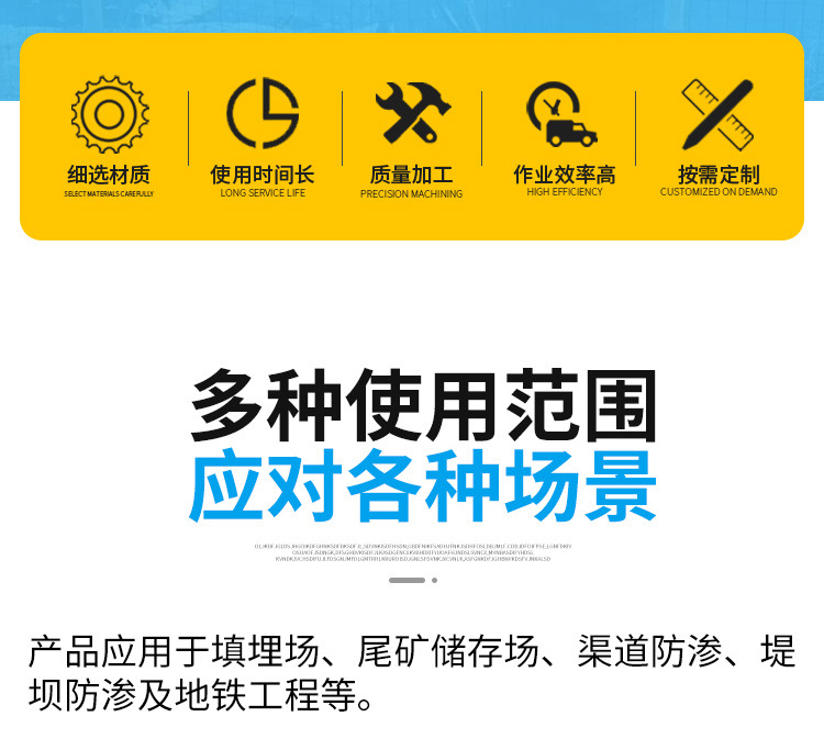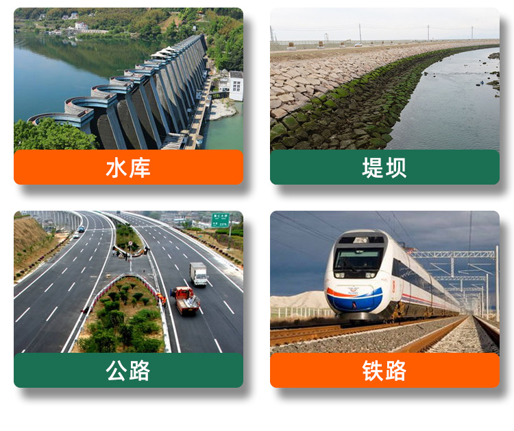 用途 | 广泛用于铁路,公路,运动馆,堤坝,水工建筑,遂洞,沿海滩涂 | ||
