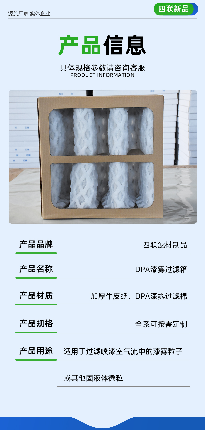 用途范围 | 适用于过滤喷漆室气流中的漆雾粒子 或其他固液体微粒 | ||