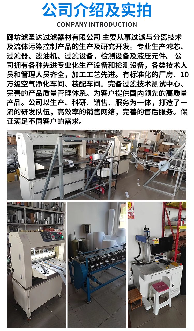 廊坊滤圣达过滤器材有限公司具有多年滤芯生产的丰富经验,依靠雄厚的技术力量和高素质的技术工人,先进的生产设备、完善的检测手段、健全的管理体系满足用户对过滤器的各种要求,并可以按用户的要求生产定做多种规格及不同性能的异型滤芯及滤清器。