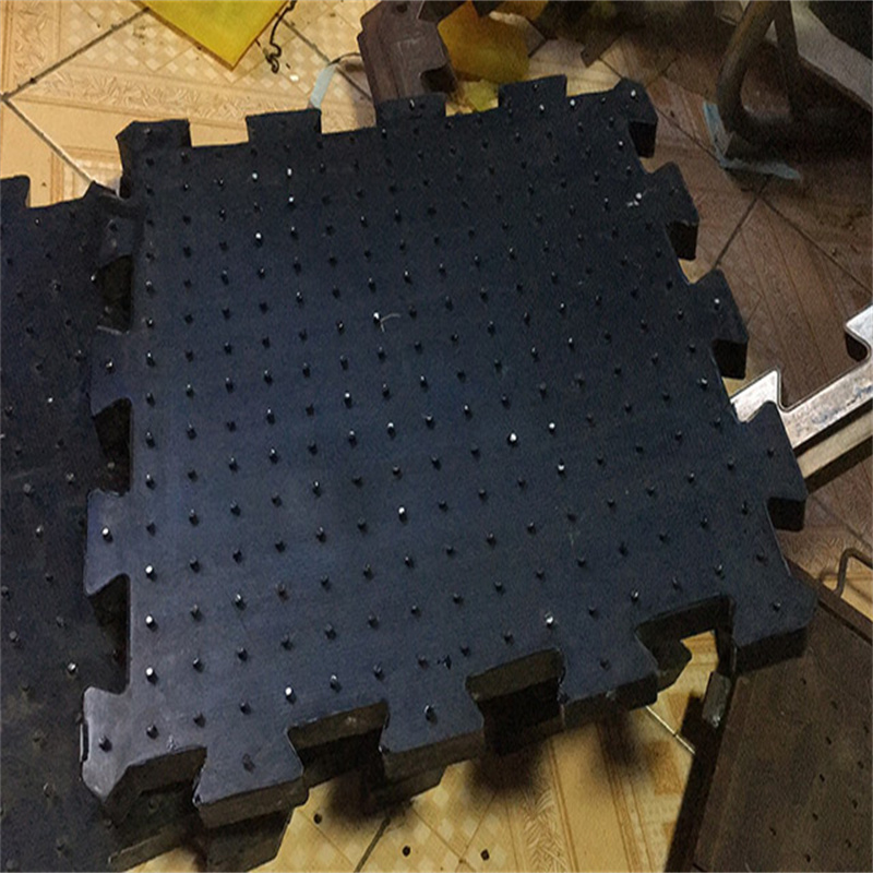 钻机转盘平台用防滑垫系采用聚氨酯板作为主体板,聚氨酯橡胶是橡胶中最耐磨的橡胶,具有强度高、弹性好、耐油耐溶剂、低温性能好和耐老化性好等特点。其表面有纵横排列的多条排污凹槽,在主体垫的上表面排污凹槽围成的方形区域内有突出胶粒和嵌入主体部份伸出表面的金属钉组合。突出胶粒和金属铆钉规则地交错排列,突出胶粒的高度和金属铆钉伸出垫块上表面的高度既能有效防滑又可使操作人员站在垫上无不适感觉。
