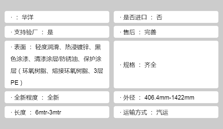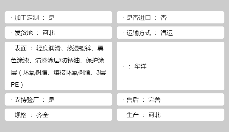 表面 | 轻度润滑、热浸镀锌、黑色涂漆、清漆涂层/防锈油、保护涂层(环氧树脂、熔接环氧树脂、3层PE) | ||