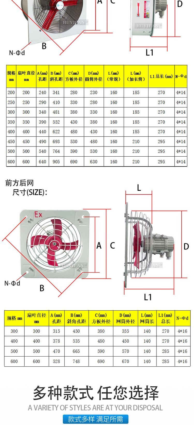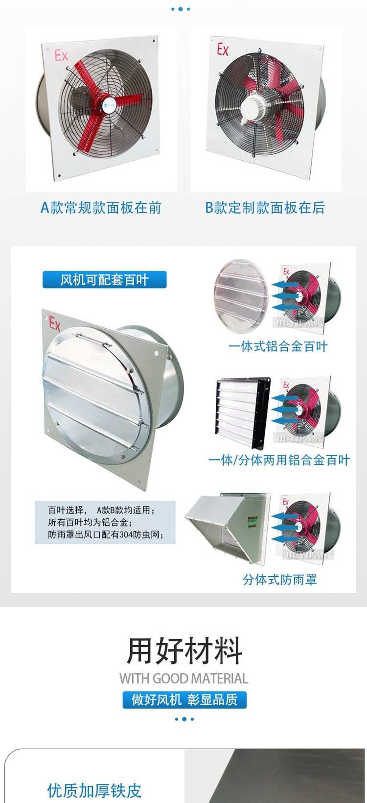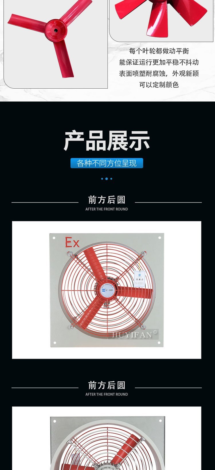 2. 防爆排风扇面板采用优质钢板焊接成型,叶片由铝合金压铸成型, 表面高压静电喷塑;