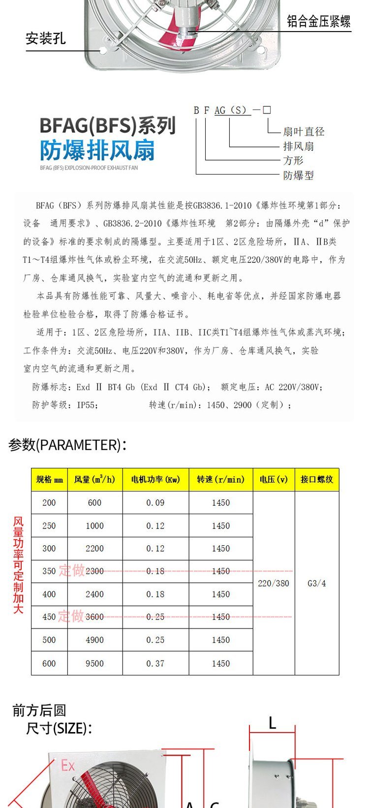 1. 防爆排风扇由防爆电机、压铸铝合金叶片、面板等部分组成;