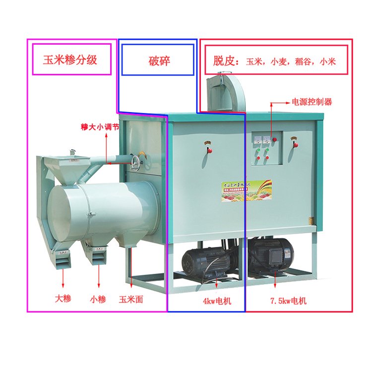 ? ? ?? 6FT-T3是一款组合式的玉米初加工设备,由脱皮系统、破碎系统、分级系统、风网除尘系统等四大系统组成,设备操作方便,外型美观、坚固耐用、性能可靠,产量高,电耗低,此款玉米脱皮制糁机、玉米碴子机可以对玉米一次性完成简单清理、脱皮、除胚芽、去根据、去黑棋、破碎、分级、制糁、磨粉、分级、抛光、精选等工序,得到各种颗粒度大小的玉米糁和高精度玉米粉,新型三道风网四道除尘,加工出来的成品质量非常光滑、圆润、无黑星、无皮子、色泽金黄,完全达到进入超市的水平。工艺为干湿两用,不但可以加工玉米,小麦、水稻、高粱、大豆等各种杂粮都可以加工。主要适用于广大农村和城乡结合部对外加工的粮食加工作坊,还可以往超市送货。