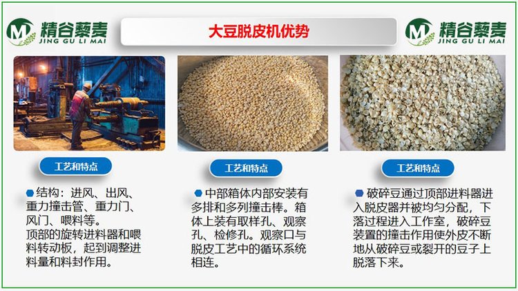 该黄豆脱皮机,皮、仁和黑脐部分脱离干净,碎粒少,脱皮效果好,产量大小均可定制,适合黄豆加工厂或者食品厂使用。同时,也可调节机器对黑豆、豌豆、鹰嘴豆等等脱皮,提升豆制品比如豆腐,豆汁、腐竹,豆奶粉等口感。