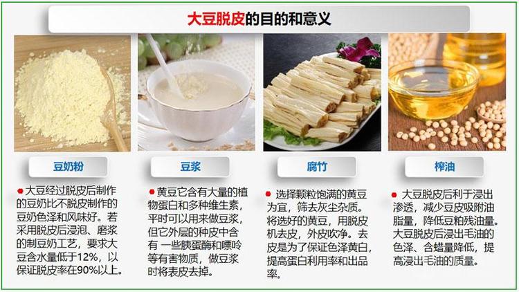 为适应市场需要,改善传统机械设备加工黄豆费时费力、重复加工、成品率低的不足,本公司研制生产的新款免烘干黄豆脱皮机,打破传统黄豆脱皮模式。