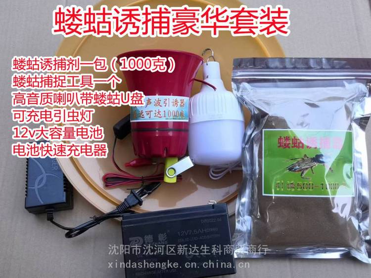 蝼蛄诱捕豪华套装200一套包括? ?蝼蛄诱捕剂一包(1000克)? ?蝼蛄捕捉工具一个? ??高音质喇叭带蝼蛄U盘? ?可充电引虫灯? ??12v大容量电池电池快速充电器