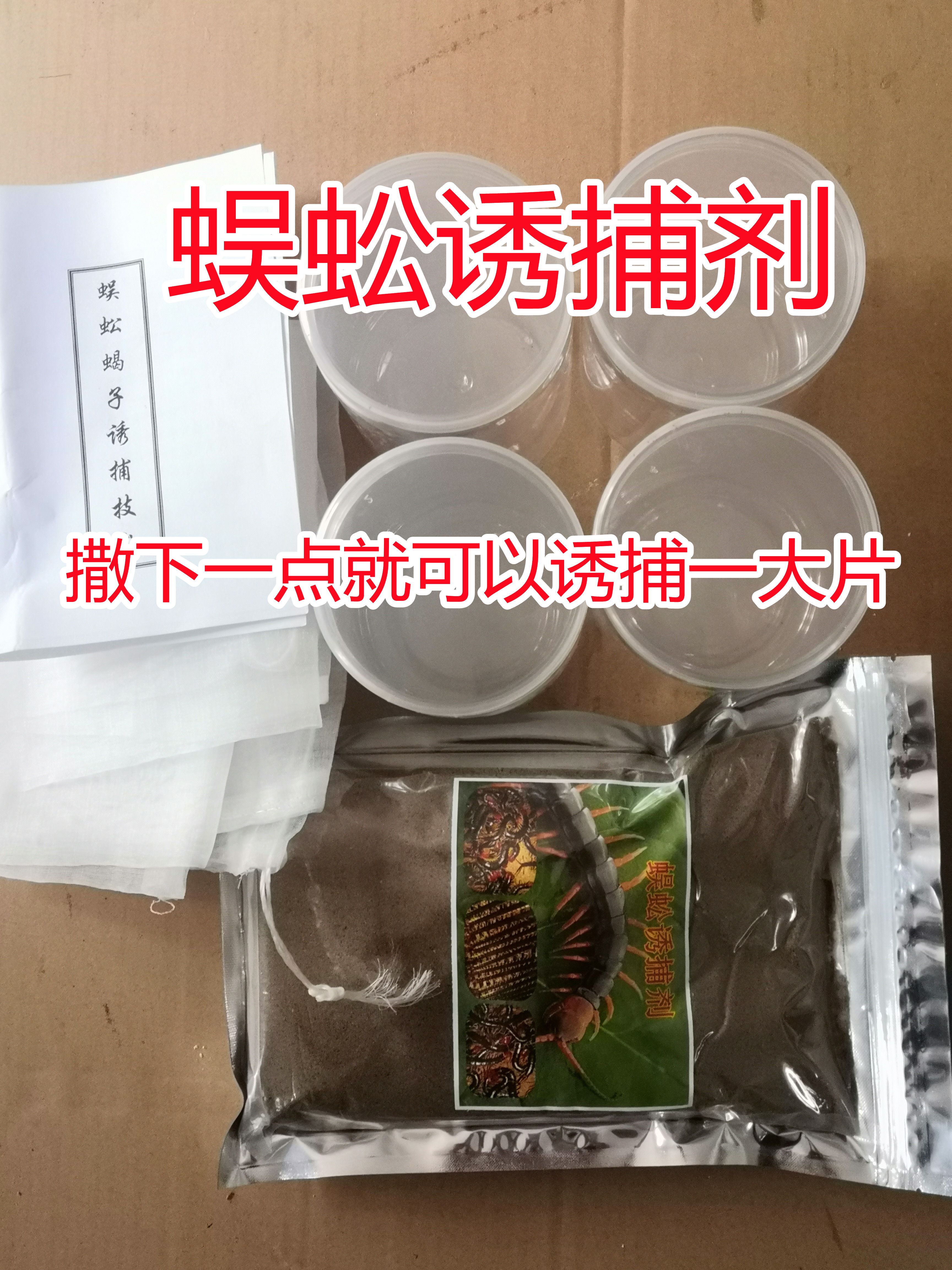 本产品一套150元包括诱捕剂一包一公斤装,四个蜈蚣捕捉器,还有操作教程和技术资料配方