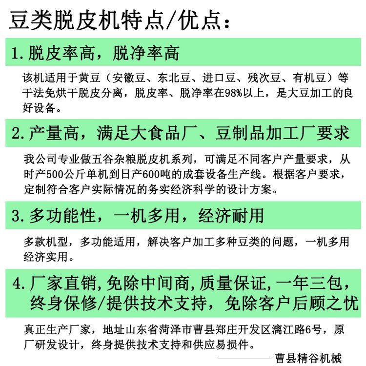 为适应大型厂家高产量豆类脱皮需求,我公司研发了各种大产量的脱皮单机,时产1吨-10吨,可以单独使用,也可嵌入到大型设备流水线中,支持日产12-600吨的成套设备,根据客户要求,我们提供设计方案,从原粮清理,脱皮,抛光,分级,色选,除尘,收集,包装等一系列生产流水线。本公司企业法人吕经坤从事杂粮加工行业三十余年,对此行业有着这方面的话语权,掌握着本行业的核心技术。欢迎来厂参观考察。