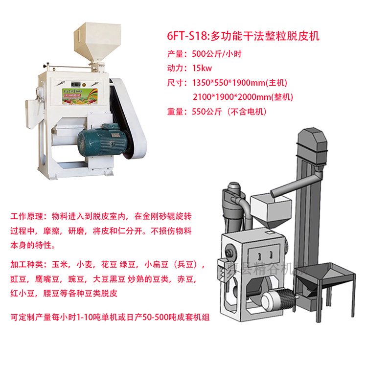 适用于S18整粒脱皮机,多功能脱皮机,用于扁豆,绿豆等多种豆类脱皮,脱皮率高,成品率高,对原粮胚芽不破坏,主要利用内置的金刚砂辊高速旋转,金刚砂石对原粮表皮摩擦,分离表皮与豆仁,表皮通过内置的吸风除尘系统排出,脱皮后的豆仁都出口流出,使用于玉米,小麦,花豆,绿豆,小扁豆(兵豆),豇豆,鹰嘴豆,豌豆,大豆,黑豆,炒熟的豆类,赤豆,红小豆,腰豆等各种豆类脱皮。