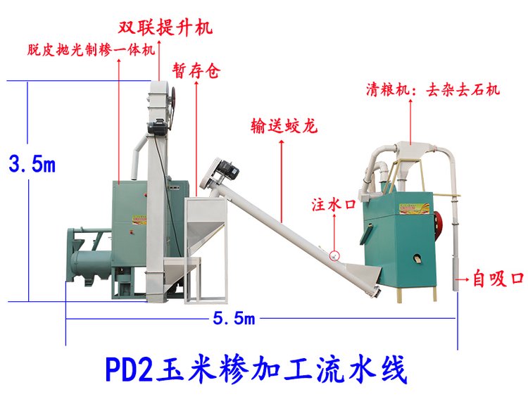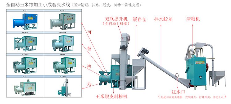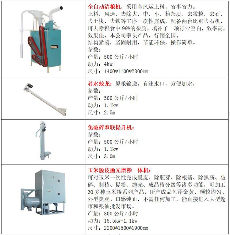 主要设备组成:全自动粮食清选机、原料输送蛟龙、暂存仓、双联提升机,转换仓,玉米脱皮破碎制糁机。