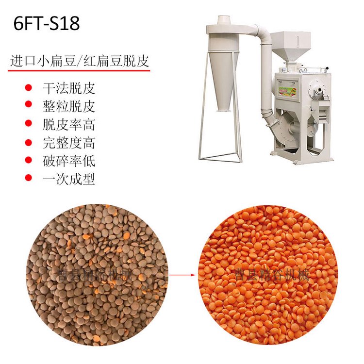 扁豆有红白两种,原产印度,分布在热带、亚热带地区,如非洲、印度次大陆与印尼等,中国南北均有种植。国内的黄扁豆居多,国外的红扁豆居多。? ? 本公司生产的多功能豆类干法脱皮机,可脱多种豆类,杂粮:玉米 ,小麦,大麦,高粱,扁豆,红豆 ,黑豆,豌豆,鹰嘴豆,绿豆等干法整粒脱皮。脱净率高95左右,脱皮率98左右,坚固耐用,无易损件。
