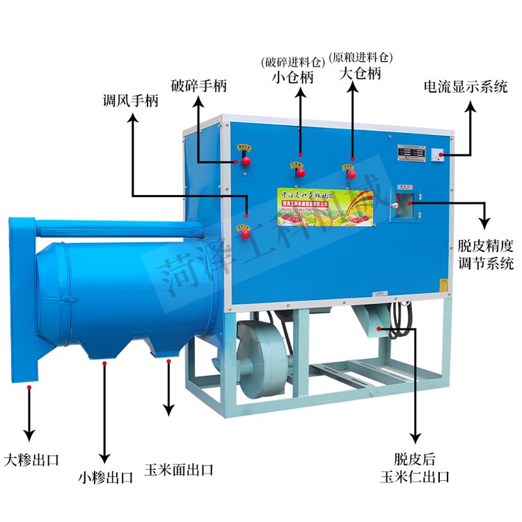 ???? 干湿两用。该机外型美观、坚固耐用、操作方便、性能可靠。可对玉米一次性完成清理、脱皮、除胚、去根、去黑脐、破碎、取糁、分级、抛光。加工后的成品玉米糁可直接进入大型超市和粮油批发市场。能生产二十二个品种的成品糁。新增加了无级破碎系统、四道风网除尘、二次备用除尘系统。大豆、水稻脱皮去壳均可。为本公司拳头产品。