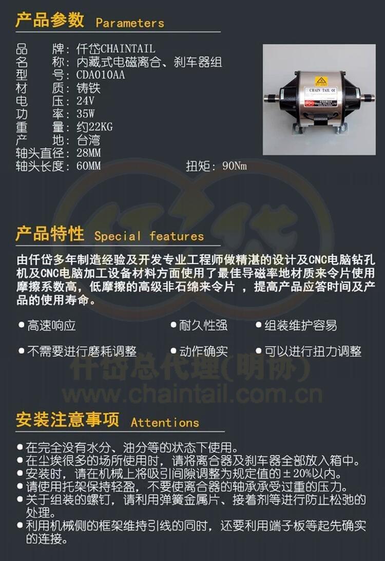 十公斤双出轴电磁离合刹车器CDA010AA/CDA010AF台湾仟岱离合刹车器组,工作电压DC24V,扭力100NM,广泛应用于陶瓷机械,木械机械,食品机械,全自动中板拼板机等产品,用于定位传送切离,具有响应快,吸力大,耐磨耗等特性。仟岱大陆总代理,广州仟岱机电有限公司。