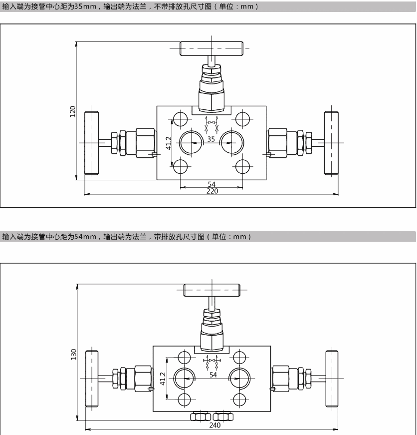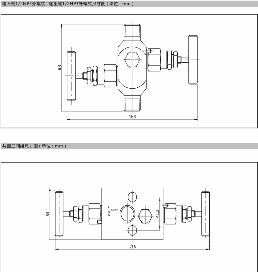 二,二阀组适用于智能压力变送器产品配套,其作用是从引压点将信号引入压力变送器测量室,使引压点与测量室接通或断开,为压力变送器不可缺少的配件。一般用于现场控制仪表上,为仪表提供多通路,减少安装工作量,提高系统可靠性。