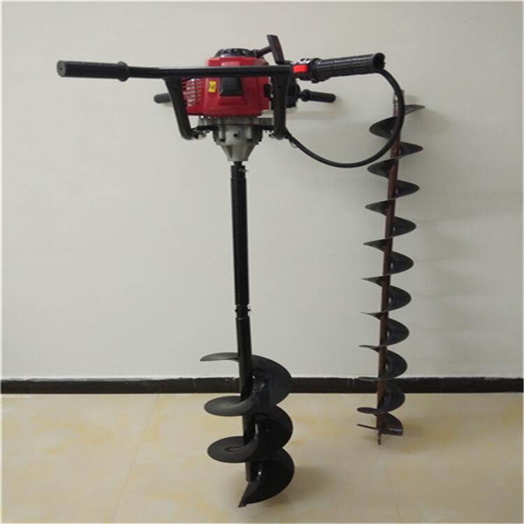 植树挖坑机是由扶着操作,不用机械带动,自配动力的钻坑机器。此款选用大马力汽油机为动力,带动螺旋式锰钢钻头,销土刀片进行切土,油门控制钻头转速,每40秒左右均可完成一个穴。速度快、效率高,是人工的30多倍。钻头由钻尖、刀片、导土片和钻杆组成。
