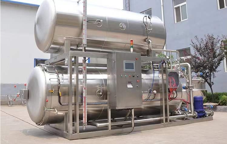 节约能源,提高产量,在杀菌过程中使用的工作介质可循环使用,节省了能源,时间及人力,物理的消耗,降低了生产成本,两台杀菌锅同时使用一罐热水工作,比双层单军国产能提高一倍。