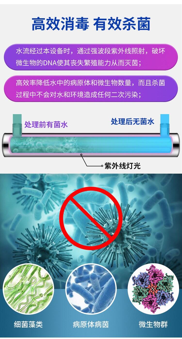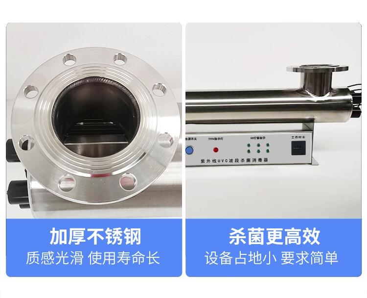 紫外线杀菌器具有无死角、光射条件好、能耗低、设备安装拆卸灵活方便,无二次污染等特点,紫外线杀菌器相对氯 气杀菌,他具有不需要添加化学药剂,无二次污染,无混合设备,大大减少设备运行成本,如果是饮用水,紫外线杀菌器安全,不会因为药剂的过量而对人体产生不利的影响。紫外线杀菌器相对臭氧杀菌器,他具有能量消耗小,无大的混合器,无鱼腥味等优点,不仅感观好,而且减小运行成本
