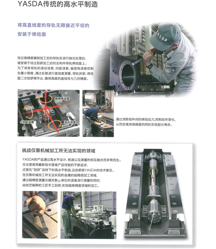 日本安田亚司达YASDA加工中心超精密零件加工。例如惯性导航仪器体系中的气浮陀螺的浮子及支架、气浮陀螺马达轴承等零件的尺度精度、圆度和圆柱度都要求到达亚um级精度;人造卫星仪器轴承是真空无光滑轴承,其孔和轴的外表粗糙度Rα到达1nm,圆度和圆柱度均为纳米级精度,这些零件都是用超精细金刚石刀具镜面车削加工的。精细液压控制体系中的精细伺服阀的阀芯与阀套的配合精度也常在亚微米等级,它是用超精细磨削办法加工的。